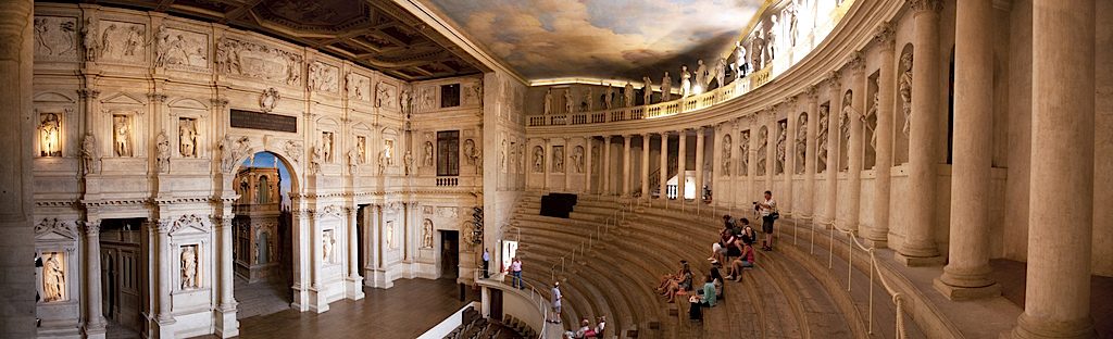 Es quizás la obra de mayor envergadura de Palladio y uno de los 3 teatros renacentistas que aún están en pie en Italia. Se puede decir que es el primer teatro moderno de la humanidad en cuanto a ser un Teatro cerrado y techado, con un escenario diseñado para lograr perspectivas e isometrías visuales importantes, de igual manera destaca el proscenio que simula un foro romano. Nace acá la Academia en Italia y su visita es obligada para entender el espacio escénico moderno
